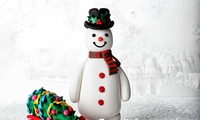 5 Od zelenog i crvenog fima izradite šal za snjegovića. Izvaljajte uske rolice od obje nijanse, prislonite ih naizmjence jedan uz drugi i zagladite ih valjkom. Zatim rezačem izrežite šal u širini koju želite i omotajte ga snjegoviću oko vrata.