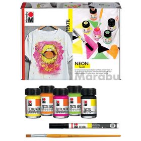 Neon boja za tekstil, na vodenoj bazi, sadrži 4 neon nijanse po 15 ml (neon žutu, neon narančastu, neon zelenu i neon rozu), 1 crnu boju za tekstil od 15 ml, 1 flomaster za tekstil debljine vrha 1-2 mm u crnoj nijansi i 1 kist Universal broj 8.