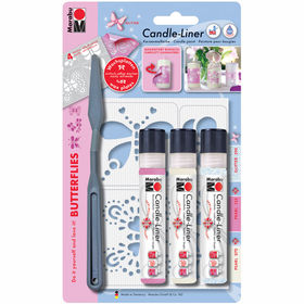 Creamy, soft candle paint. Contains: 3 x 25 ml (pearl white, glitter opal, pearl rose), 1 paintknife and a self-adhesive stencil with 4 different butterfly motifs.
