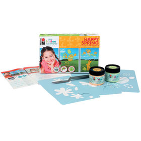 Window stencilling paint. Set contains 2 shades of Glas Tattoo paint 100 ml (satin apple and satin mango), 3 stencils 15 x 25 cm and 1 painting knife.