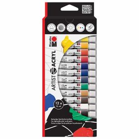 Contents: 12 x Artist Acryl 12 ml (Primary yellow 919, Cadmium yellow deep 921, Vermilion 936, Carmine red 911, Permanent violet 951, Ultramarine blue 958, Phthalo blue 953, Phthalo green light 964, Light ochre 928, Burnt umber 948, Titanium white 970, Carbon black 974)