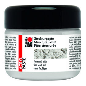 Light, fine sand, white, matt, water-based acrylic structural paste. Ideal for multi-layer applications and three-dimensional structural effects (flocati effect), as well as for collages and relief stencilling. For use on canvas, wood, paper, cardboard, self-curing modelling clays, polystyrene, glass, metal, stone. When dry can be painted with all Marabu-Acrylic paints such as BasicAcryl, Decormatt Acryl and Decorlack Acryl, or mixed with up to 20% of paint - resulting in pastel shades, depending on amount of colour proportion. Weatherproof. Drying time: 2-24 hours, depending on thickness of application.