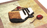 6 Glue the parts of the cake onto the board. First the whole piece, then the cherry coating and at the end place a cherry near the plate.