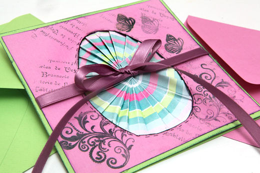 4 Glue the fan shaped paper on the greeting card (check the cut of the egg). Glue two decorative ribbons on the edges.