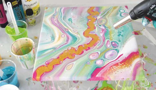 With the help of a flambé or hand gas burner, stimulate cell formation through heat. The heat comes upwards and with that, the silicone oil begins cell formation, or rather the fascinating play of oil and paint.