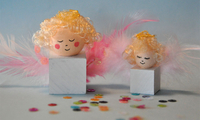 S djecom izradite preslatke figurice anđela. Postupak je vrlo jednostavan, a od materijala vam trebaju: kuglice od vate s nacrtanim licem, drvene kockice, perje, pištolj za vruće lijepljenje, bouillon žica i vilina kosa.