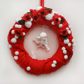 Vjenčić za vrata omotan pamučnom trakom i ukrašen snijeg kuglama.