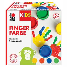 Marabu Kids Fingerfarbe (fingerpaint) - Gusta boja na vodenoj bazi, za slikanje prstima, rukama, kistom, spužvom i sl. Za podloge poput papira, kartona, drva, prozora i sl. Potpuno neškodljiva za djecu. Set sadrži 4 boje po 100ml (crvena, žuta, plava, zelena). Sve nijanse mogu se međusobno miješati. Lako se opere sa glatkih podloga. S tkanina se može ukloniti pomoću sapuna i hladne vode odmah kada nastane mrlja (malo namakati ukoliko je potrebno).
