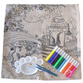 U setu su: 1 jastučnica 45x45 cm, 2 kista, 12 boja (dovoljno za oslikavanje jedne jastučnice) i 1 paleta.