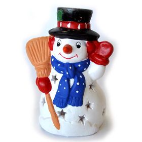 Keramički svijećnjak za lučice u obliku snjegovića. Visina 15 cm, promjer 8 cm.