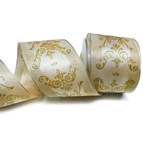 Traka saten krem sa zlatnim ukrasima, 60 mm. Cijena se odnosi na 1 metar. Molimo napomenite koliko metara naručujete.